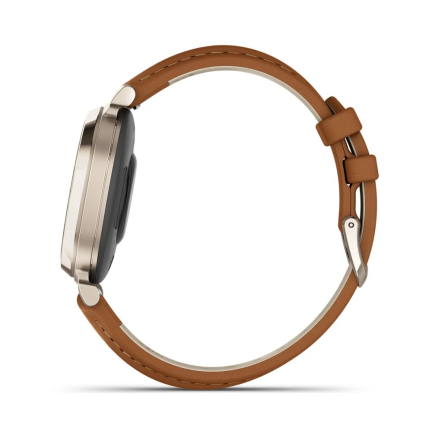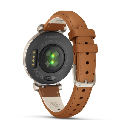 Garmin Lily 2 Classic встречает аккуратным, чуть более «взрослым» дизайном: корпус стал визуально строже, а узкие ремешки из обновлённой кожи сидят по-часычески мягко. В сравнении с первой Lily форма сохранилась, но стекло теперь чувствуется плотнее, а гравировка под ним — деталь, которая делает модель отличимой среди линейки. Габариты остались миниатюрными, так что часы по-прежнему воспринимаются как аксессуар, а не как гаджет с тяжёлым спортивным характером.
